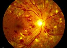 | HYPERTENSIVE RETINOPATHY This eye shows some of the damage that can be done by uncontrolled high blood pressure. |